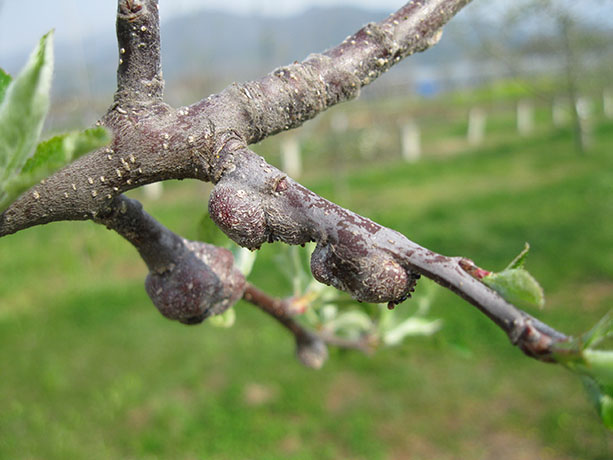 幹や枝の切り口、小枝の分岐部、新梢や徒長枝の発出部、根部などに群がって吸汁加害する。加害部位には虫えい(虫こぶ)が形成され、養水分の流通が妨げられる。新梢の葉柄基部に虫えいが形成されると、落葉することもある。また、果実のこうあ部に寄生し、分泌物で果実が汚染されることもある。